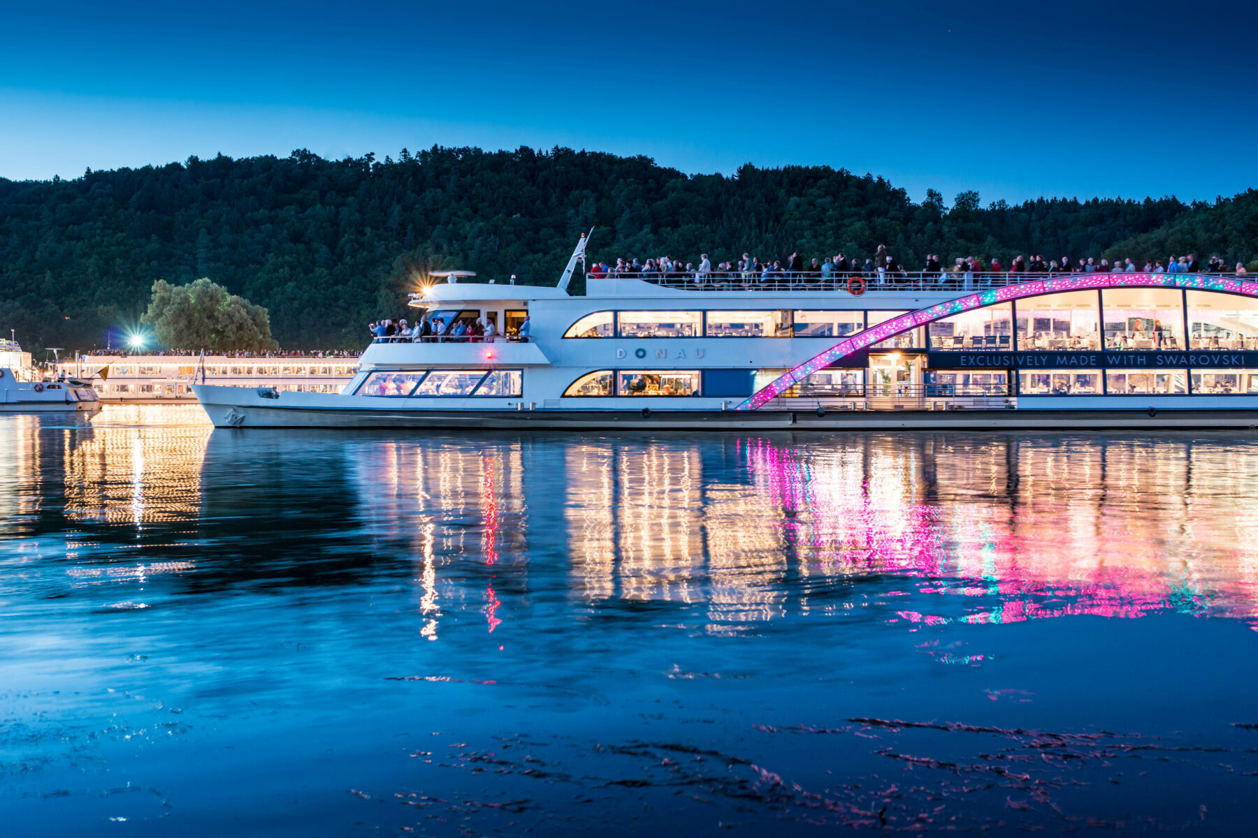 Ab Passau gleitet das luxuriöse Schiff durch die Nacht, während funkelnde Swarovski-Kristalle, italienische Live-Musik und das köstliche 4-Gänge-Menü, mit dem Sie die Küche verwöhnt, für eine einzigartige Atmosphäre sorgen.
